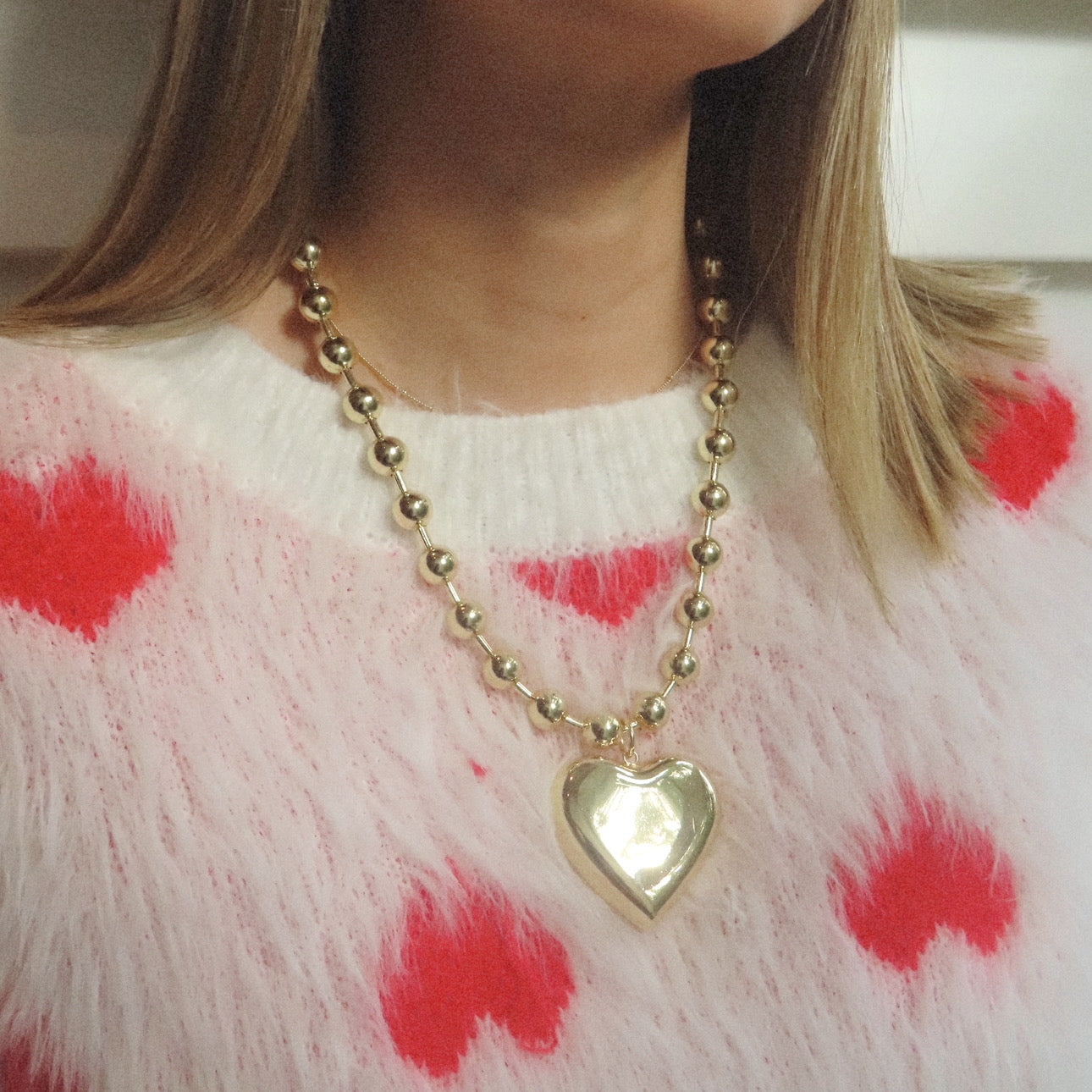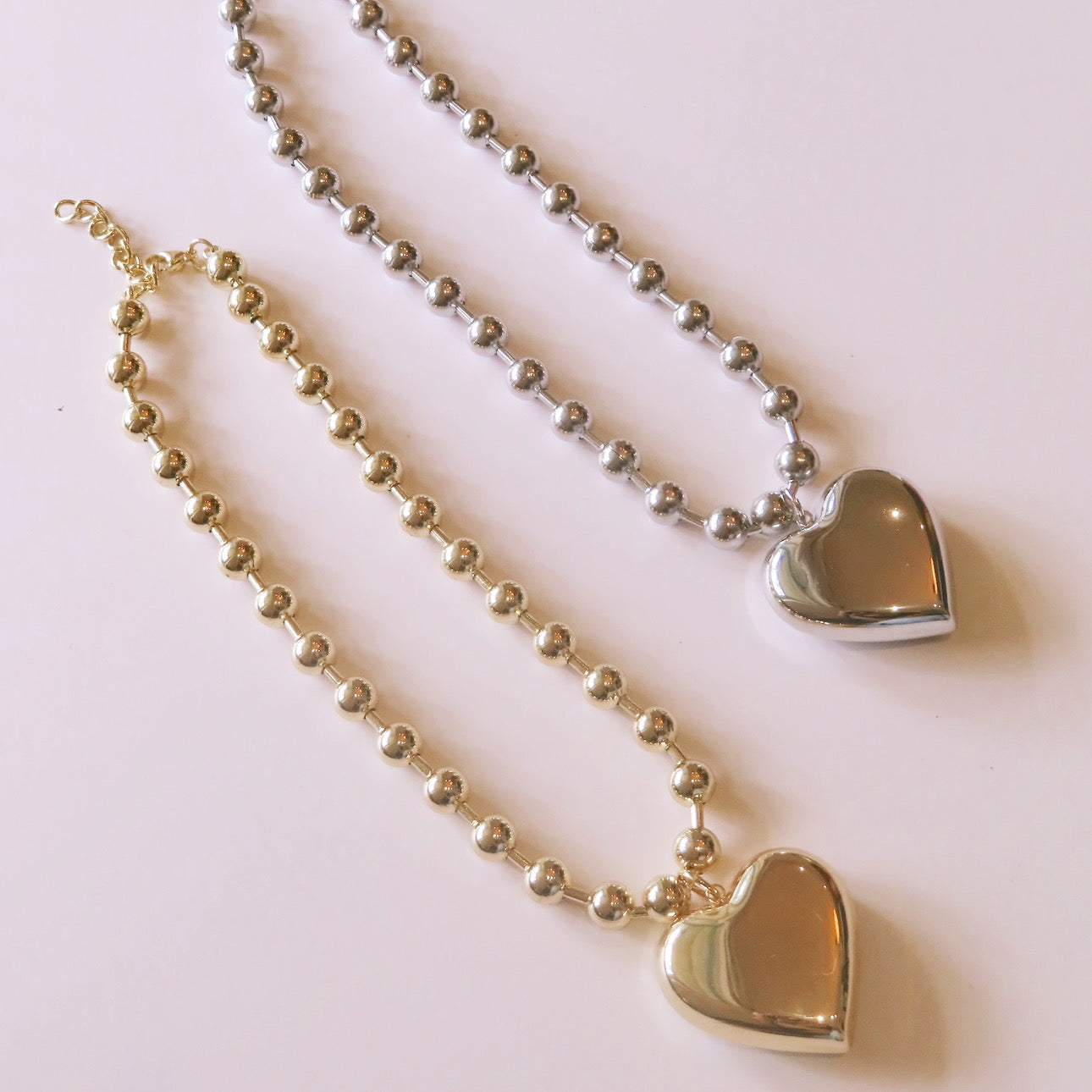 Make a bold statement with our Chunky Heart Bead Necklace, a playful yet chic piece designed to stand out. Featuring a strand of polished metallic beads and a glossy puffed heart pendant, this necklace is crafted from durable brass with high-quality gold plating for a rich, mirror-like shine.
