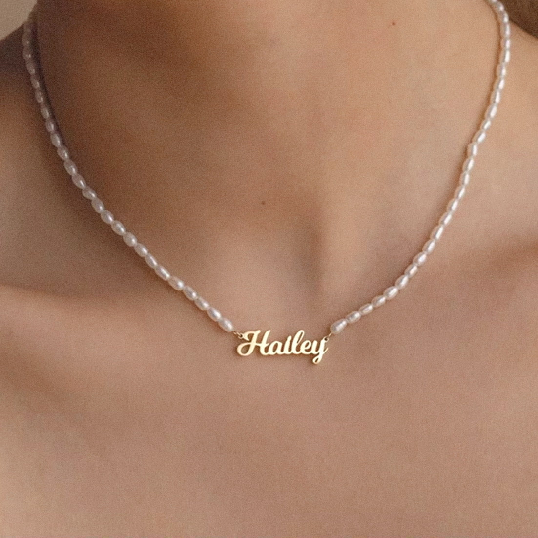 Timeless elegance meets personalized charm in our Custom Pearl Name Necklace. Carefully handmade with delicate freshwater pearls and a durable, polished stainless steel nameplate, this piece brings together softness and strength in perfect harmony.