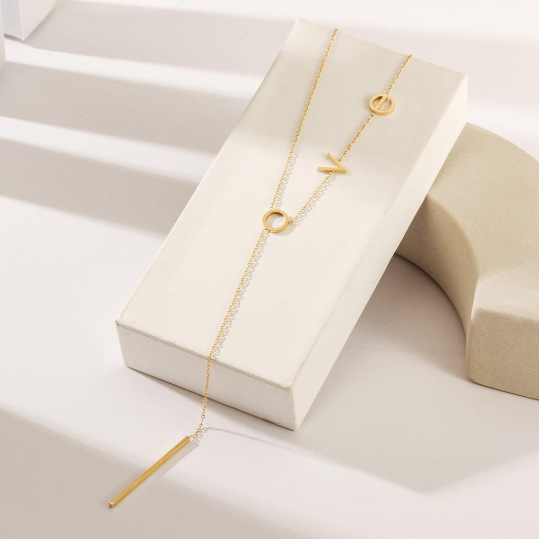 An L O V E lariat necklace is a type of necklace that spells out the word "LOVE" in a lariat style. The lariat style typically consists of a chain or cord that is longer than a regular necklace and does not have a traditional clasp. Instead, the necklace is worn by looping one end through a larger loop or opening at the opposite end, creating a customizable and adjustable length.