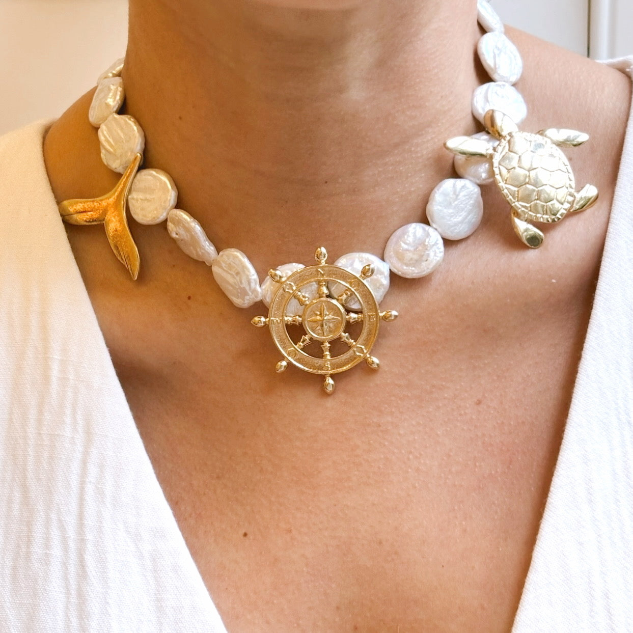 Make waves with our Nautical Charm Statement Necklace, a stunning handmade piece that blends coastal elegance with bold personality. Featuring natural freshwater coin pearls and detailed gold-plated charms — including a turtle, whale tail, and ship wheel — this necklace is a tribute to the ocean and its magic.