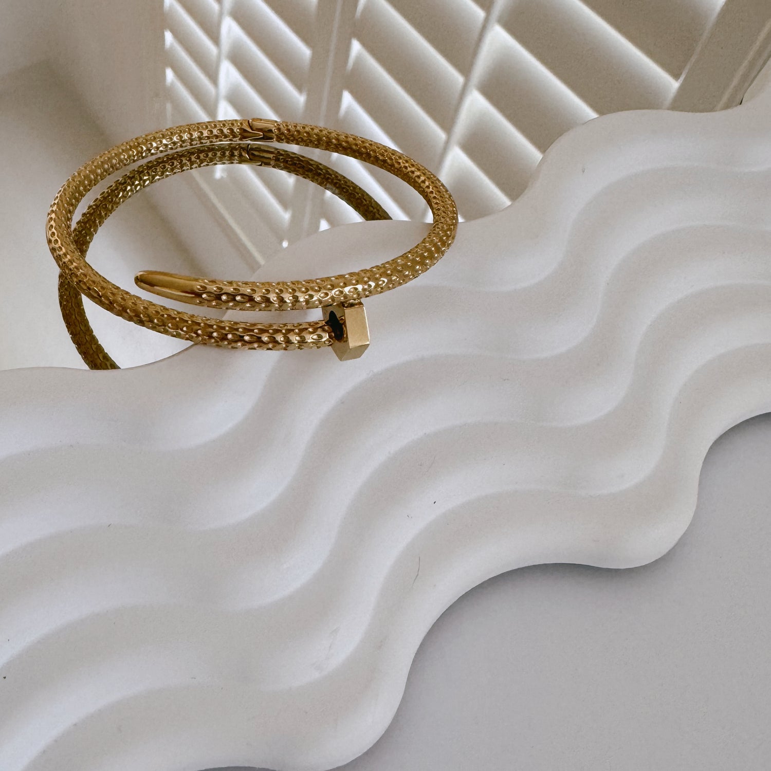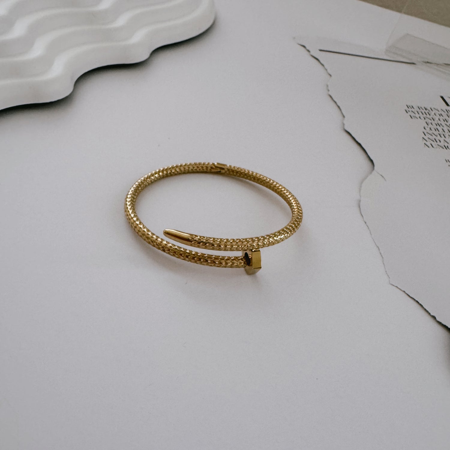 Introducing our Silvana Bangle crafted from durable stainless steel, blending sleek design with contemporary style. Inspired by industrial elements, this bangle features a unique nail-shaped design, adding a bold and edgy touch to your accessory collection. The stainless steel construction ensures durability and longevity, while the minimalist aesthetic makes it a versatile piece that can be worn alone or stacked with other bracelets for a trendy look. Elevate your wrist game with this modern and statement-making nail bangle.