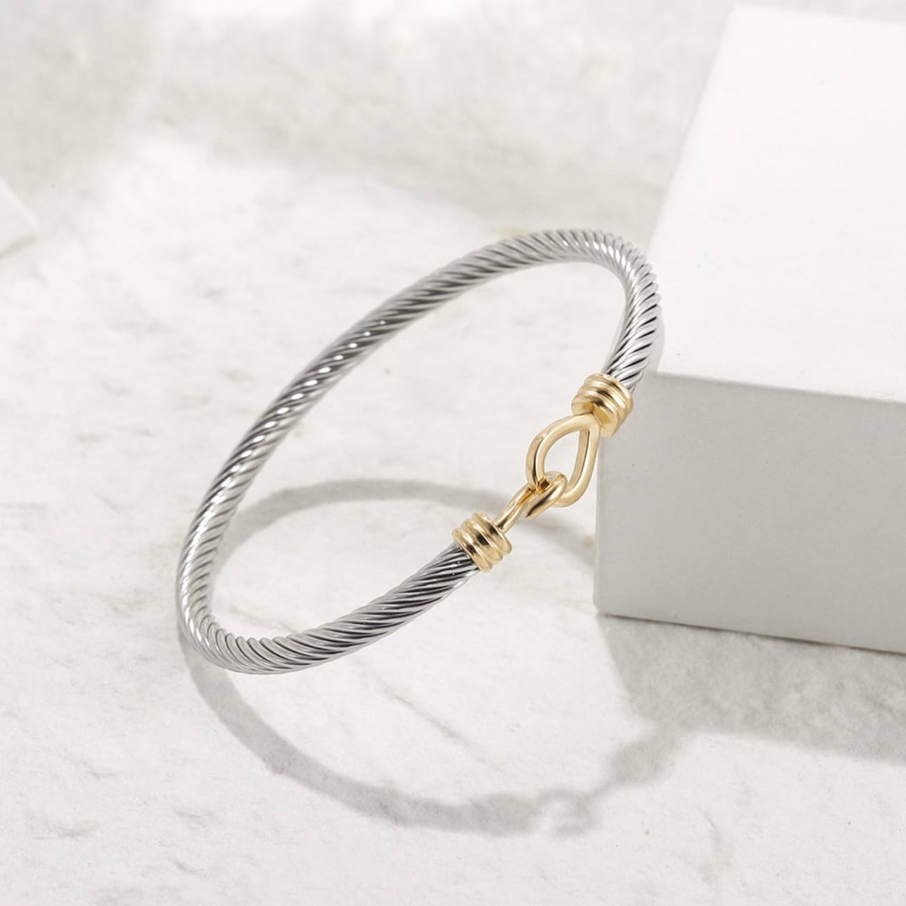 Timeless, sleek, and effortless — our Twisted Cable Hook Bracelet brings a modern edge to your everyday style. Crafted from durable stainless steel, this bangle features a signature twisted rope design with a minimalist hook clasp for easy wear.