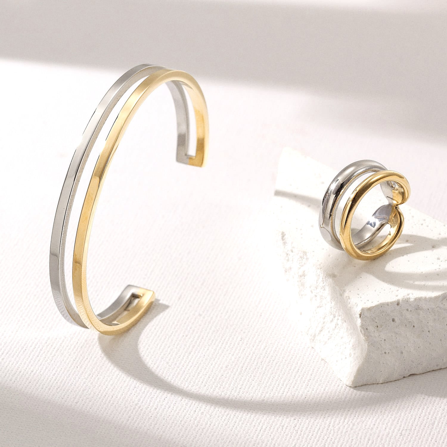 Complete your look with this elegant ring, designed to pair perfectly with our Vana open bangle bracelet. Made from premium stainless steel and available in a stunning gold and silver finish, this ring is both stylish and versatile. Its adjustable design ensures a comfortable fit for any finger, while its modern, two-tone look makes it the perfect complement to any outfit. Wear it solo or stack it with your favorite rings for a chic, layered look.
